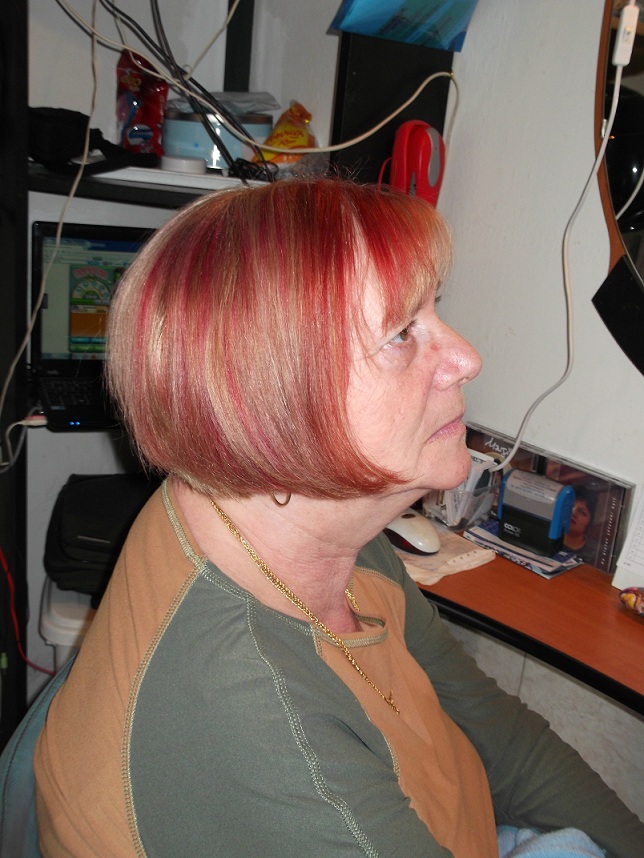Előre hosszabbodó haj, hátul kissé felszedve, + pink melír